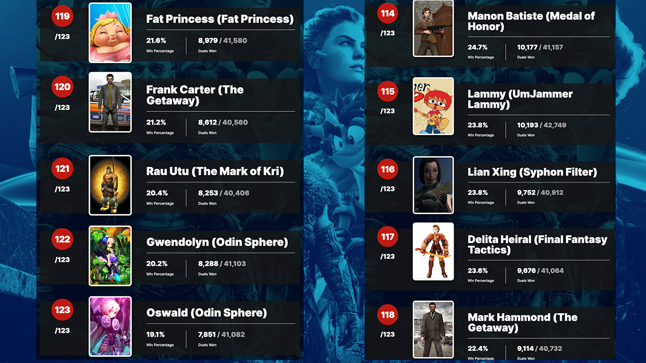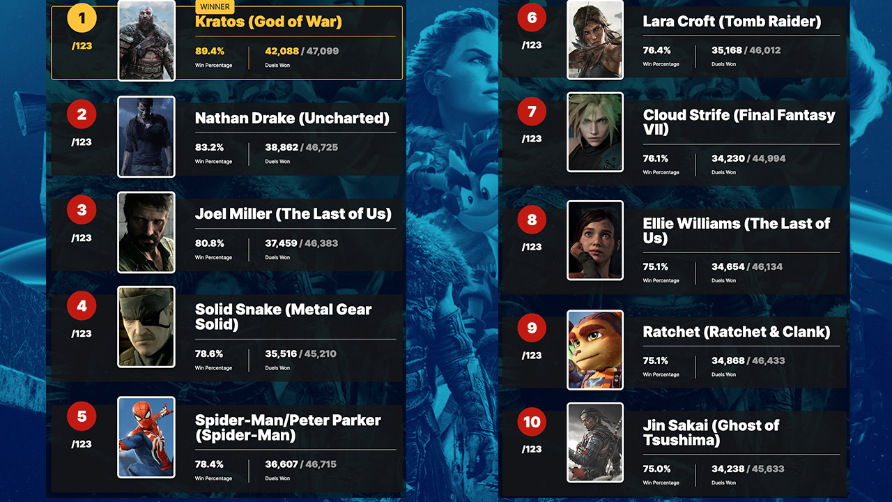 Are you wondering where your favorite PlayStation characters landed, like maybe Aloy? (She took spot #13) For all the rankings, you can check out the full list of where all 123 PlayStation characters that competed in the face-off ended up.