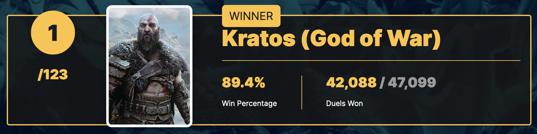 BOY… what a choice. With an 89.4% win percentage that’s worthy of the gods, Kratos has defeated all who stood in his way yet again to claim this coveted Platinum Trophy. The star of God of War Ragnarok and the character who first appeared on PlayStation 2 in 2005 secured victory in 42,088 of his 47,099 battles.