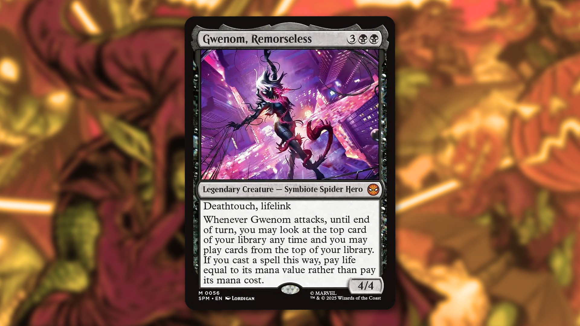 Gwenom, Remorseless is down to just $13 now, and is a 4/4 with deathtouch and lifelink who can play card from the top of your library. The fun thing is that you pay for those cards with life instead of mana, hence why that lifelink keyword is handy.
