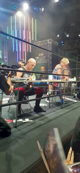 All Elite Wrestling’s Christopher Daniels and Ryo Mizunami sign autographs for fans at the AEW: Fight Forever booth.