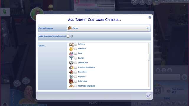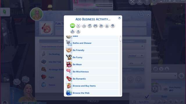When you first come up with your small business idea, you can choose up to five activities that sims will be partaking in when they visit. Some of these activities require specific items, and the game lists them when you hover your cursor over each option. So if one of the options you select is “play pub games,” for example, you’ll need to have at least one dartboard, ping pong table, or foosball table. It’s useless to assign an activity that your customers aren’t actually able to do.