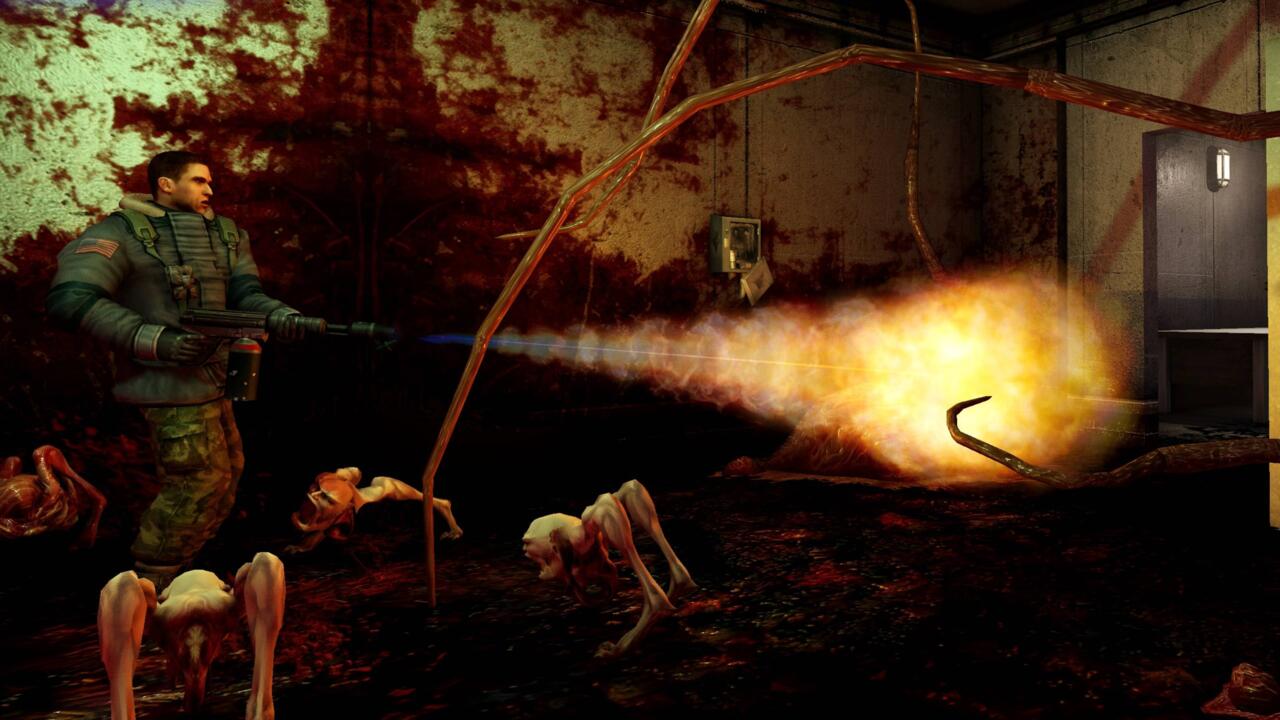 The game’s setup is one of its better aspects, acting as a direct sequel to John Carpenter’s iconic 1982 film. You play as the bland, one-dimensional Captain Blake, leader of a U.S. Special Forces rescue team sent to investigate Outpost 31 in the isolating tundra of Antarctica. Of course, we know what transpired when MacReady and the rest of this research facility encountered the shape-shifting alien life-form, and it doesn’t take long before Blake is fighting off all manner of horrific entities. He’s rather nonchalant about the whole thing, though, anchoring a relatively thin story that feels distinctly 2002 in all the worst ways. While it begins as a more action-oriented facsimile of the film it’s ostensibly a sequel to, the narrative quickly delves into predictable territory with the military experimenting on the Thing to use the alien for its own gain. It’s all very stereotypical, with melodramatic voice acting and–aside from a fun cameo from John Carpenter himself–an inherently disposable cast of characters.