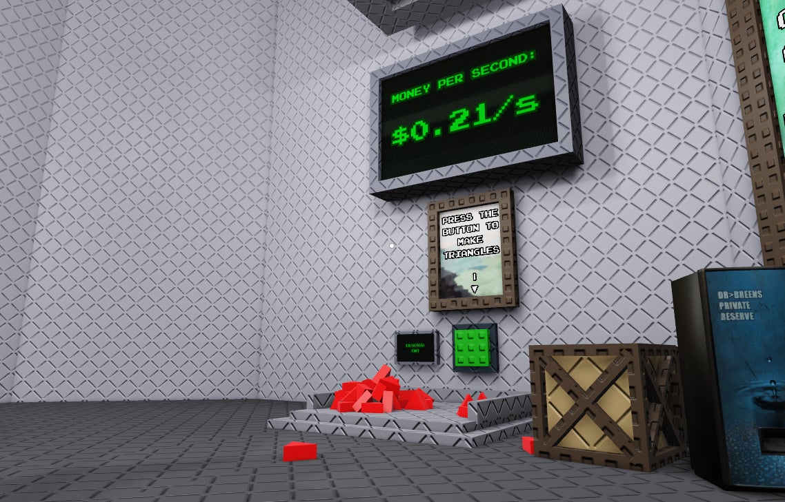 Triangulate is a Roblox game all about making cold, hard cash by selling stacks of… well, triangles. Playing alone or with friends, you’ll enter a circular zone with a vent that dumps out piles of triangles that you then have to transfer into a bucket on the opposite side of the room. You’ll have a quota to hit each round before a timer on the wall hits zero, with the quota increasing between rounds.