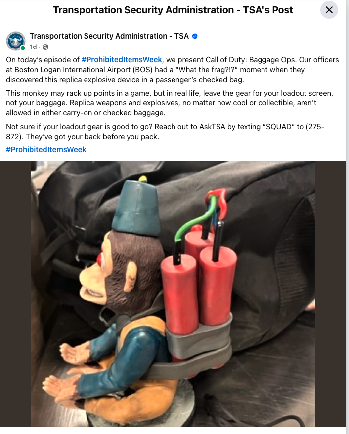 “On today’s episode of #ProhibitedItemsWeek, we present Call of Duty: Baggage Ops,” the TSA shared on Facebook. “Our officers at Boston Logan International Airport (BOS) had a ‘What the frag?!?’ moment when they discovered this replica explosive device in a passenger’s checked bag. This monkey may rack up points in a game, but in real life, leave the gear for your loadout screen, not your baggage. Replica weapons and explosives, no matter how cool or collectible, aren’t allowed in either carry-on or checked baggage.”