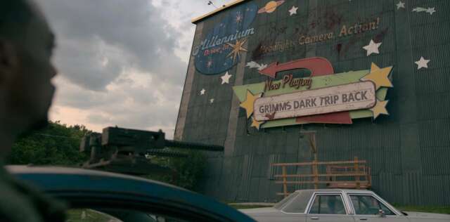 Dollface (Krista) and John go to an old drive-in movie theater called the Millennium Drive-In. This is also a location in the level Millennium Drive in Twisted Metal: Black. The movie that’s advertised on the outside–“Grimm’s Dark Trip Back”–is the name of the second story mode in the 2012 reboot.