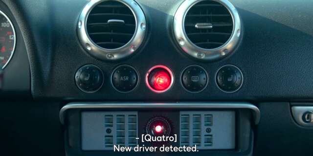 Quatro is a sentient car. The red light on its dashboard, along with its flat affectation, are direct callbacks to HAL, the advanced computer in 2001: A Space Odyssey (1968).