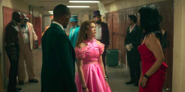 Mayhem’s pink prom dress could be a homage to several ’90s romantic teen comedies, but the closest match is Bianca’s pink prom dress in 10 Things I Hate About You (1999).