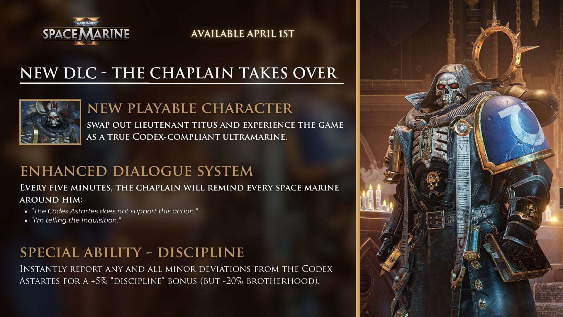 Yesterday, Space Marine 2 publisher Focus Entertainment declared that the new Chaplain class would be released as DLC on April 1.