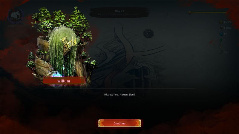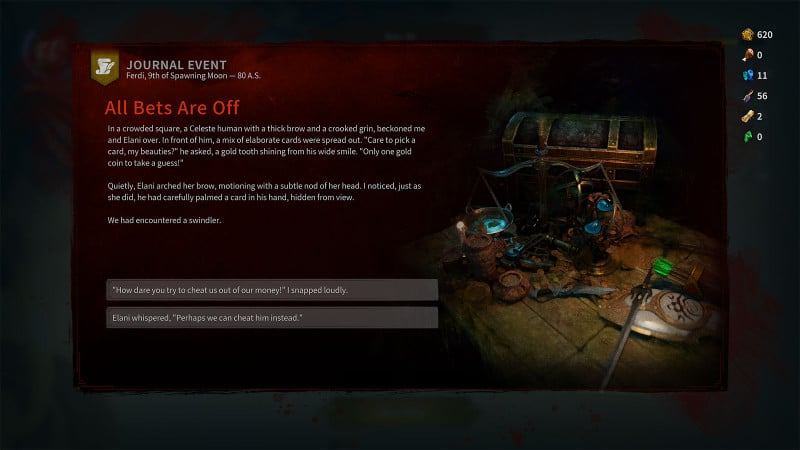 Elani and Yara flee their under-attack home through the Catacombs for each run, which places them in a moving caravan. The caravan moves along the roads and at the forks, players must make decisions about which path to take. Sometimes it might be a matter of meeting a merchant or other story moments, but often it will lead to combat.