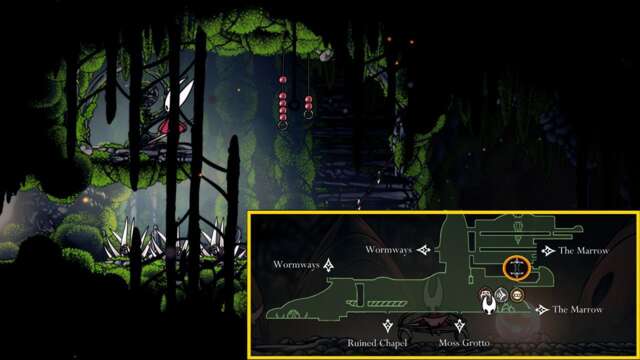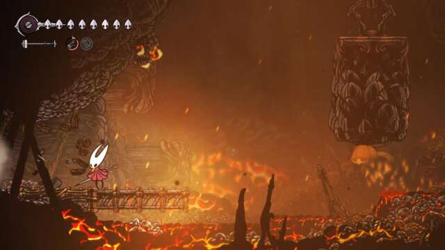 Breaking the curse in the settlement of Bellhart also needs you the Needolin ability, which allows you to strum your weapon akin to a violin. Once you’re able to do this, go to the ornate door in Moss Grotto to unlock the Weavenest Atla secret sub-zone. Use the teleporter to reach the bottommost floor. Then, double jump to the middle section and make a left. The Spool Fragment is floating above a pool just past a couple of large enemies.