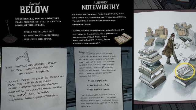There’s yet another clue on the pages of A New Clue. There’s a photo of “Corner Cases” and several rooms have a check mark. These include the Patio, Office, Nook, and Pantry. It just so happens that these rooms have notes, and you’ll notice something conspicuous when you read them.