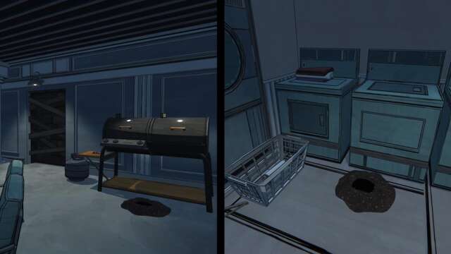 The rooms that you need to visit are the Patio and the Laundry Room. Oh, and you also need to bring a Shovel with you. You have to face the correct spot on the ground just to see the dig icon for your Shovel: