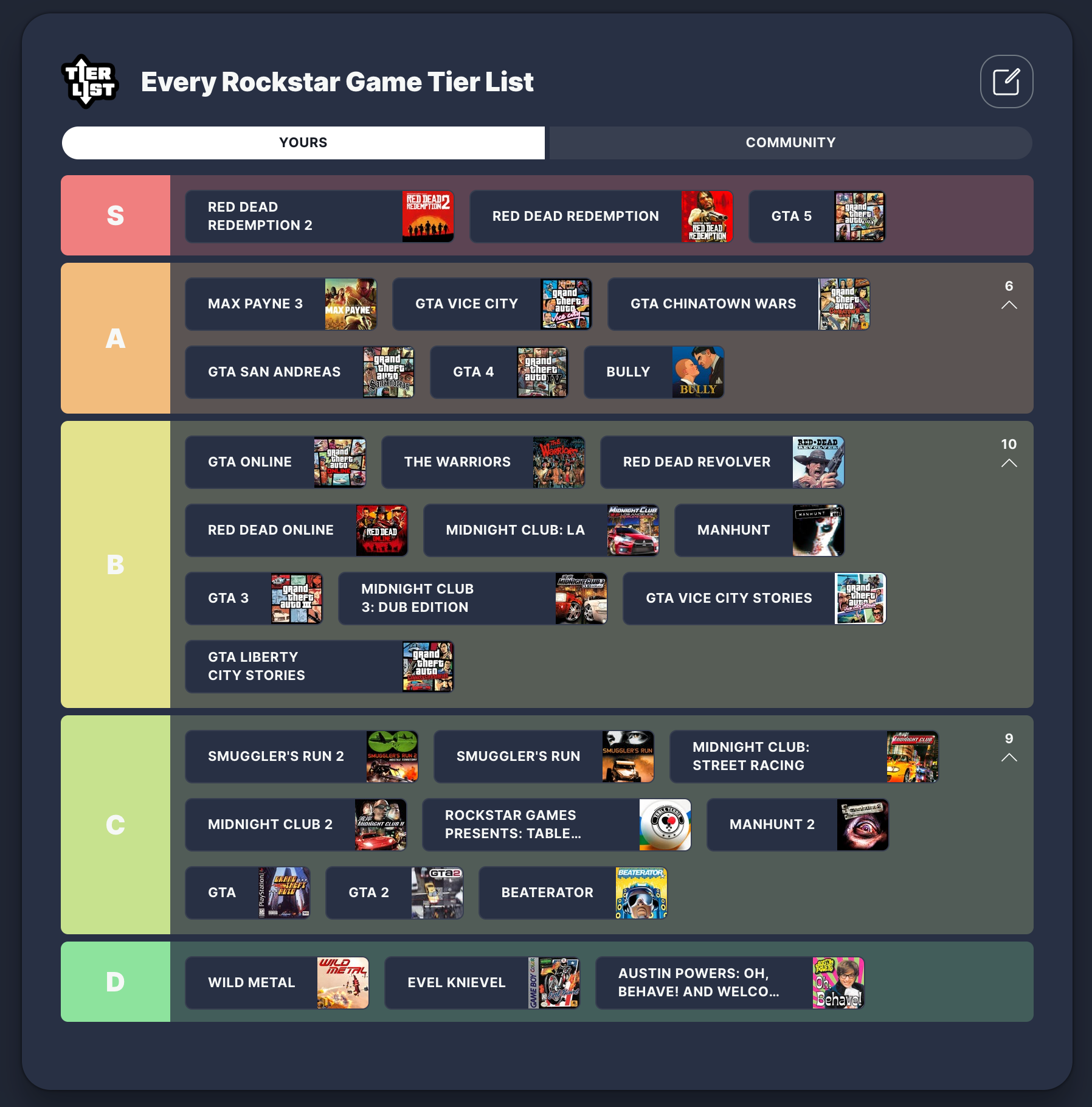 Don’t agree with me? Think that Vice City is better than GTA 4? Well, why not have a go at ranking all of Rockstar’s games yourself in a tier list below, where you can compare your own S, A, B, C, and D tiers with the whole of the IGN community.